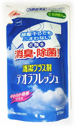 デオラフレッシュ 液体タイプ 詰替用(270ml) 【27dw11】価格: 298円レビュー評価: 5.0 レビュー数:5 名 称デオラフレッシュ 液体タイプ 詰替用 内容量 270ml 特徴 部屋干しだからニオウなんて、もう言わせません! ●部屋干しした時の洗濯物の気になるあのイヤなニオイ、その原因は雑菌です。「デオラフレッシュ」は、洗剤だけでは落ちにくいニオイや雑菌の繁殖をおさえ、衣類を清潔に仕上ます。主原料は緑茶抽出物と竹エキス。天然成分なので、敏感肌の赤ちゃんの衣類にも安心です。 ☆部屋干しでもニオわない ☆着用後の衣類についてしまう、汗などのニオイもおさえます。 ☆洗濯槽内のカビの繁殖もおさえます。 ★洗剤とは異なります!! ご注意 本品記載の使用上の注意をよくお読みの上ご使用下さい。 商品区分 洗濯用 |