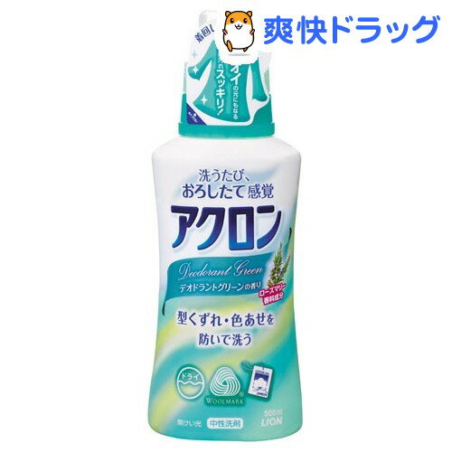 アクロン デオドラントグリーンの香り 本体 500mL★税込3150円以上で送料無料★[アクロン]価格: 378円レビュー評価: 4.5 レビュー数:4 【ブランド】アクロン【発売元、製造元、輸入元又は販売元】ライオンハウスホールド【アクロン デオドラントグリーンの香り 本体の商品詳細】●型くずれ・色あせを防いで洗う、オシャレ着用衣料洗剤です。●ニオイの元にもなる皮脂汚れすっきり!新しい「デオドラントグリーン」の香りです。ローズマリー香料成分をプラスしました。●スタイル保持成分ASPがしわ、ヨレ、縮み、色あせ、静電気を防ぐので、繰り返し洗っても、おろしたてのスタイルが長く楽しめます。静電気防止効果が加わり、衣類のいやなまとわりつきも防ぎます。●洗浄成分が繊維にすばやく浸透。弱水流コースでも、汗じみや皮脂汚れをすっきり落とします。ドラム式洗濯機に |