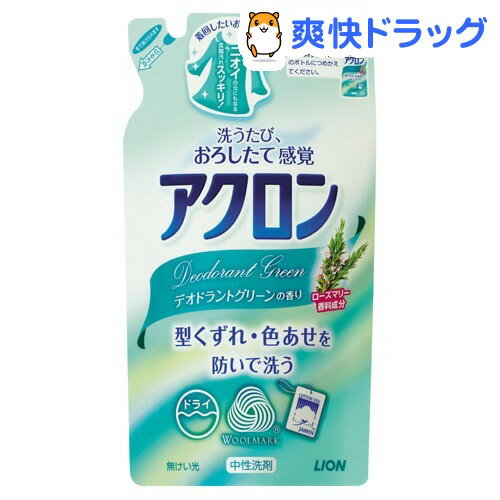 ●セール中●アクロン デオドラントグリーンの香り 詰め替え用 450mL★税込3150円以上で送料無料★[アクロン]価格: 248円レビュー評価: 4.33 レビュー数:3 【ブランド】アクロン【発売元、製造元、輸入元又は販売元】ライオンハウスホールド【アクロン デオドラントグリーンの香り 詰め替え用の商品詳細】●型くずれ・色あせを防いで洗う、オシャレ着用衣料洗剤です。●ニオイの元にもなる皮脂汚れすっきり!新しい「デオドラントグリーン」の香りです。ローズマリー香料成分をプラスしました。●スタイル保持成分ASPがしわ、ヨレ、縮み、色あせ、静電気を防ぐので、繰り返し洗っても、おろしたてのスタイルが長く楽しめます。静電気防止効果が加わり、衣類のいやなまとわりつきも防ぎます。●洗浄成分が繊維にすばやく浸透。弱水流コースでも、汗じみや皮脂汚れをすっきり落とします。●ウール・ |